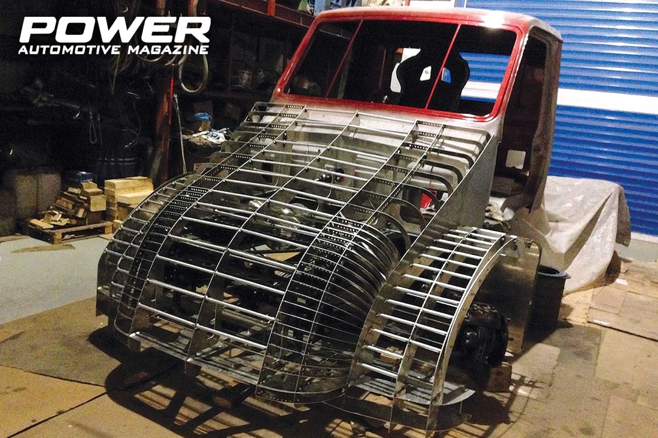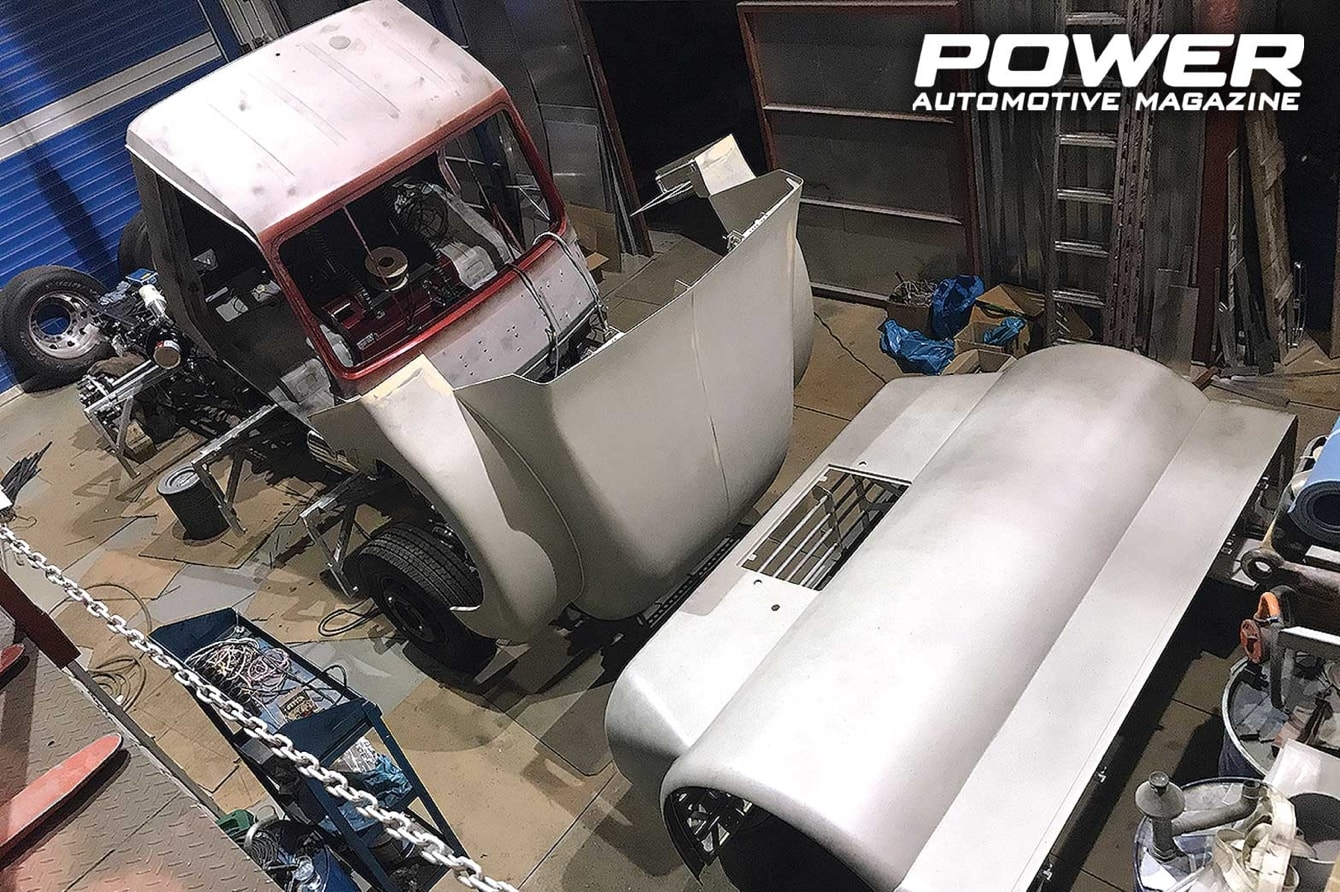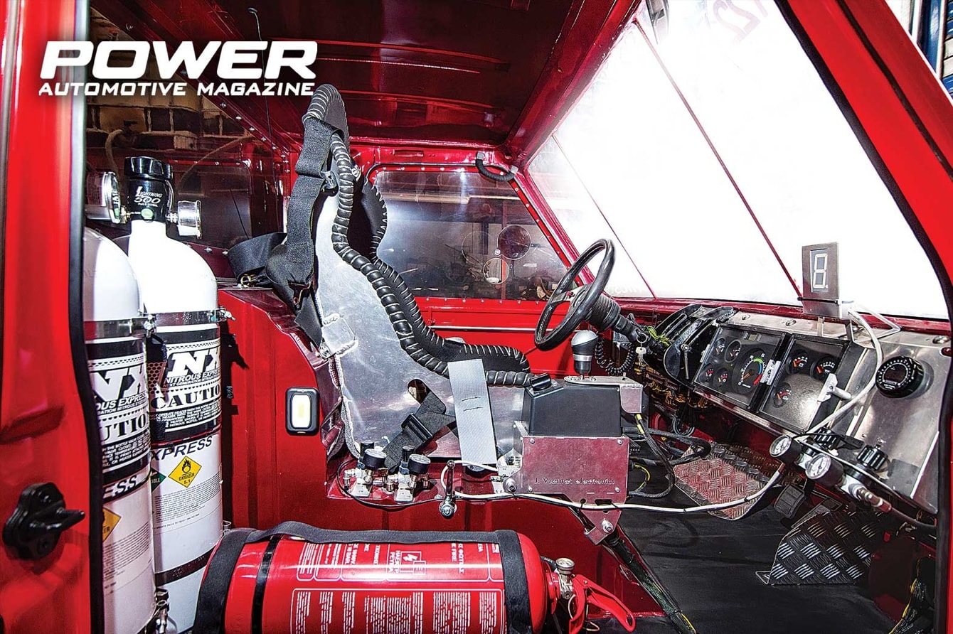 Αφού πρώτα κόπηκε σε τέσσερα σημεία και μίκρυνε σε διαστάσεις η καμπίνα, έπρεπε να αρχίσει η διαμόρφωση του εσωτερικού. Ξεκίνησε η κατασκευή του χειροποίητου αλουμινένιου καθίσματος με τα πρότυπα ασφαλείας της FIA, το οποίο πήρε τη θέση του στο κέντρο της αρκετά στενότερης -πλέον- καμπίνας και πάνω του τοποθετήθηκαν ζώνες τεσσάρων σημείων της Sparco. Παραμένουμε στο χώρο της καμπίνας και στην κατασκευή βάσης για να στηριχθεί ο ατέρμονας και η ρυθμιζόμενη κολώνα του τιμονιού, οι βάσεις στήριξης των ζωνών ασφαλείας, ενώ πλέον κάτω από την καμπίνα κατασκευάστηκαν οι βάσεις στήριξης για το ψυγείο νερού και για τα δύο βεντιλατέρ του. Το δοχείο για το ψυκτικό υγρό, το οποίο τροφοδοτεί και τα δύο τεράστια charge coolers, κατασκευάστηκε από την αρχή και βρίσκεται τοποθετημένο στο πίσω μέρος της καρότσας, μαζί με το επίσης χειροποίητο δοχείο καυσίμου των 45lt. Δεξιά από τον οδηγό τοποθετήθηκε πάνω σε μία laser cut αλουμινένια βάση ο επιλογέας του αυτόματου κιβωτίου ταχυτήτων και δεξιά -στο πίσω μέρος της καμπίνας- βρήκαν τη θέση τους δύο τεράστιες -σε μέγεθος- φιάλες για το νίτρο. Στο ταμπλό τοποθετήθηκε το στροφόμετρο και τα όργανα από το προηγούμενο αγωνιστικό. Το υπόλοιπο bodykit, αφού είχε σχεδιαστεί και ελεγχθεί και εκτυπωθεί στην 1:31 κλίμακα, πλέον έπρεπε να υλοποιηθεί και στην 1:1. Κατασκευάστηκαν από αλουμίνιο οι εσωτερικοί σκελετοί του, οι οποίοι είχαν κοπεί με laser και, στη συνέχεια, ντύθηκε με φύλλα αλουμινίου και άρχισε σιγά-σιγά να παίρνει την τελική του μορφή. Για να γίνει όμως σωστό, χωρίς να φαίνονται κολλήσεις, αλλά και για να είναι λεία η επιφάνειά του, χρειάστηκε φυσικά να στοκαριστεί, να τριφτεί και, παράλληλα, κάθε κομμάτι που κατασκευαζόταν έπρεπε να προβαριστεί επάνω στο φορτηγό. Η μούρη είναι ένα ενιαίο κομμάτι, το οποίο φυσικά μπορεί να αφαιρεθεί, όπως επίσης και το πίσω μέρος του bodykit, το οποίο έχει και τις απαραίτητες οπές για να βρίσκει δίοδο διαφυγής ο αέρας. Στο πίσω μέρος τοποθετήθηκαν δύο αλεξίπτωτα της Simpson, αφού πρώτα μελετήθηκε η θέση τους ως προς τη ροή του αέρα, προκειμένου να ανοίγουν σωστά και να σταματάνε με ασφάλεια το βαρύ όχημα. Η τελική μορφή του φορτηγού ολοκληρώθηκε τον Απρίλιο του 2018. Τότε κατασκευάστηκαν πολυκαρμπονικά παράθυρα, τα οποία βάφτηκαν για να γίνουν φιμέ και περάστηκαν με προστατευτικό βερνίκι. Χρειάστηκαν 20 κιλά κόκκινου χρώματος για το βάψιμο του αυτοκινήτου και στη συνέχεια, η TSH Designs επιμελήθηκε τα γραφικά που διακοσμούν το φορτηγό. Την τελική οπτική εικόνα συμπληρώνουν οι βαμμένες, μαύρες ματ ζάντες της Speedline, οι οποίες έχουν δύο Goodyear Regional 265/70R17.5 εμπρός και τέσσερα Goodyear Truck Racing semislicks, σε διάσταση 315/70R22.5, στους πίσω τροχούς. Πλέον, αφού είχε τοποθετηθεί εξωτερικός διακόπτης για το ρεύμα, πυροσβεστήρας στην καμπίνα και μετρήθηκε το βάρος του που έφτασε τα 4.600kg, το φορτηγό φωτογραφήθηκε και πήρε το χρυσό βιβλιαράκι της ΟΜΑΕ και στη συνέχεια αγωνιστικές πινακίδες από την ΕΛΠΑ. Πριν φτάσουμε όμως εκεί, έχουμε μπροστά μας αρκετές ακόμα εργασίες για να ολοκληρωθεί το αγωνιστικό.