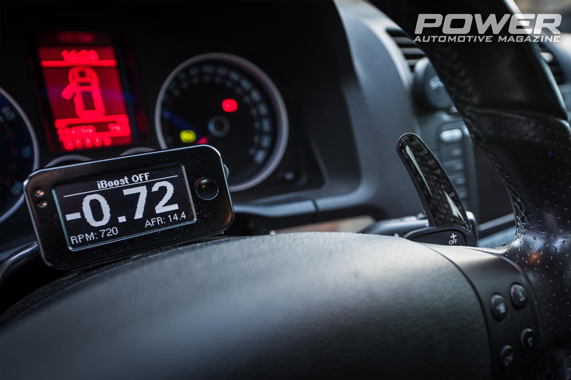 Όπως είπα και πιο πάνω, ήθελε κάτι να που να τα κάνει όλα, οπότε στο εσωτερικό -για την καθημερινή μετακίνηση και όχι τις μαχητικές βόλτες ή τους αγώνες- διαθέτει δερμάτινες καθισματάρες, γιατί κάνει και τις ταξιδάρες του. Επίσης, το μόνο που έχει προστεθεί είναι το boost controller πίσω από το τιμόνι και τα carbon extensions στα paddles του DSG. Ο θόρυβος της εξάτμισης δεν περνάει στην καμπίνα για να γίνει ενοχλητικός, στους αγώνες όμως με το ξήλωμα που πέφτει με πολλές από τις επενδύσεις να αφαιρούνται, η κατάσταση αλλάζει.