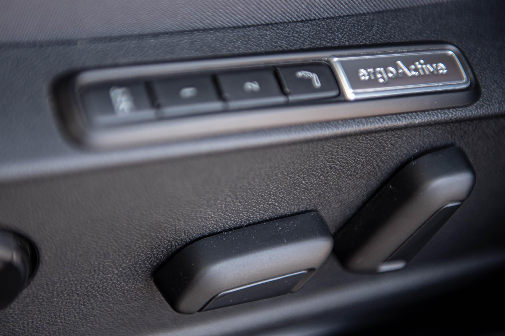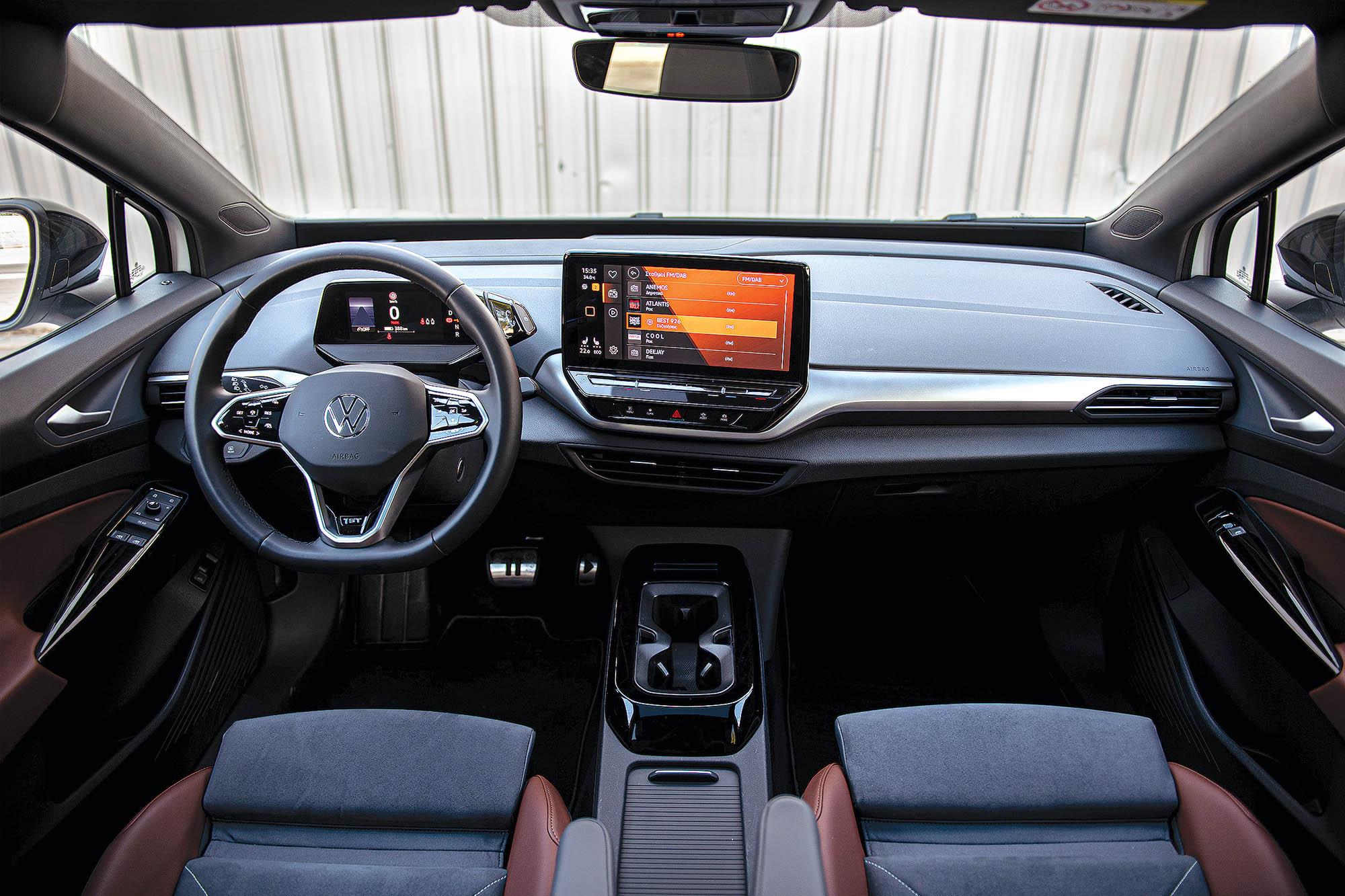 To design της καμπίνας ξεχωρίζει για την απλότητα, τα ποιοτικά υλικά και την απουσία φυσικών διακοπτών. Αυτό ενισχύει φυσικά τη μινιμαλιστική αισθητική, δημιουργεί όμως και μερικά εργονομικά ψεγάδια. Για παράδειγμα, αντί για τέσσερις διακόπτες παραθύρων στην πόρτα του οδηγού, υπάρχουν μόνο δύο και ένα πλήκτρο αφής πάνω από αυτούς που εναλλάσσει τον έλεγχο της μπροστά και της πίσω σειράς παραθύρων. Φυσικά δεν χρειάζεται να σας πω τι συμβαίνει στο 80% των περιπτώσεων που πάτε να κατεβάσετε το παράθυρο σας... Εξοικείωση χρειάζεται όμως και το σύστημα infotainment. Η οθόνη αφής έχει χορταστική διαγώνιο 12in (10in στις βασικές εκδόσεις) και πολύ όμορφα γραφικά, αλλά το μενού είναι πολύπλοκο, όπως και στο Golf VIII και στο ID.3, δεν υπάρχει επιλογή Back, μόνο επιστροφή στο αρχικό μενού, ενώ και εδώ θα προβληματίσει η έλλειψη φωτισμού στις touch-sliding μπάρες για την αυξομείωση της έντασης και της θερμοκρασίας.