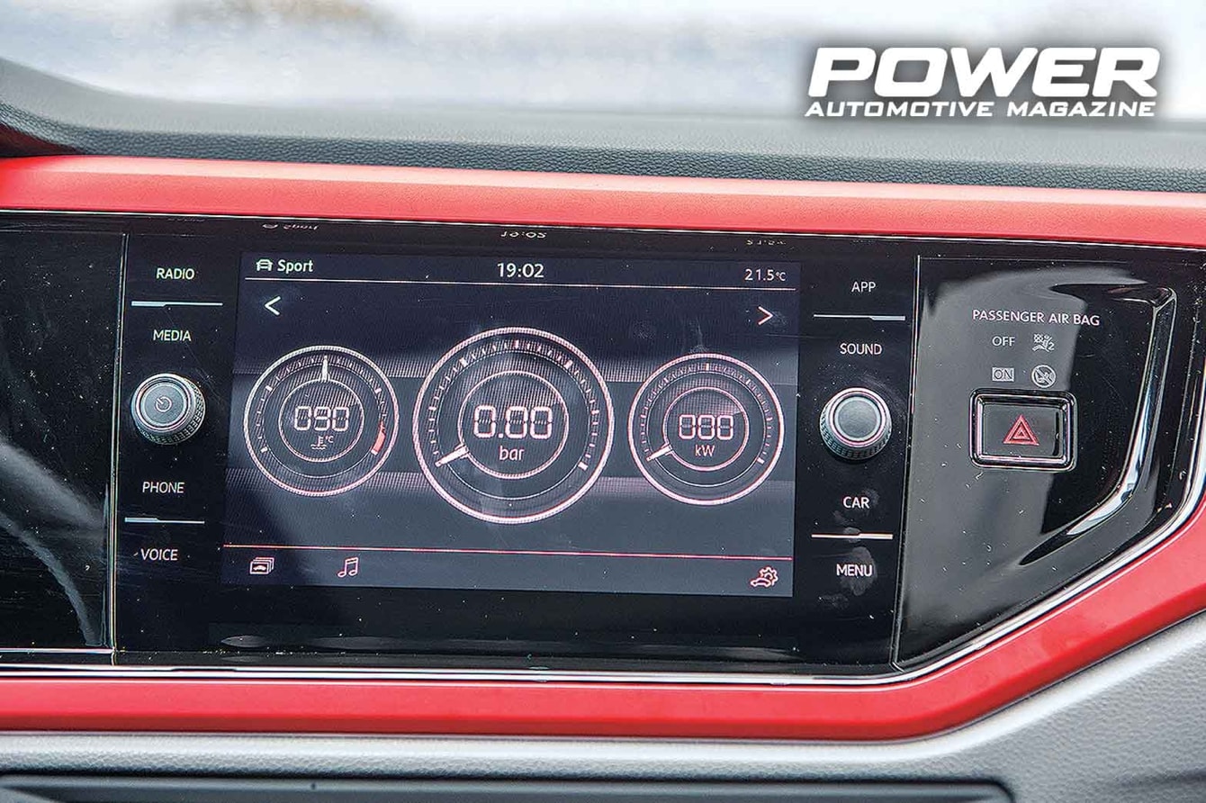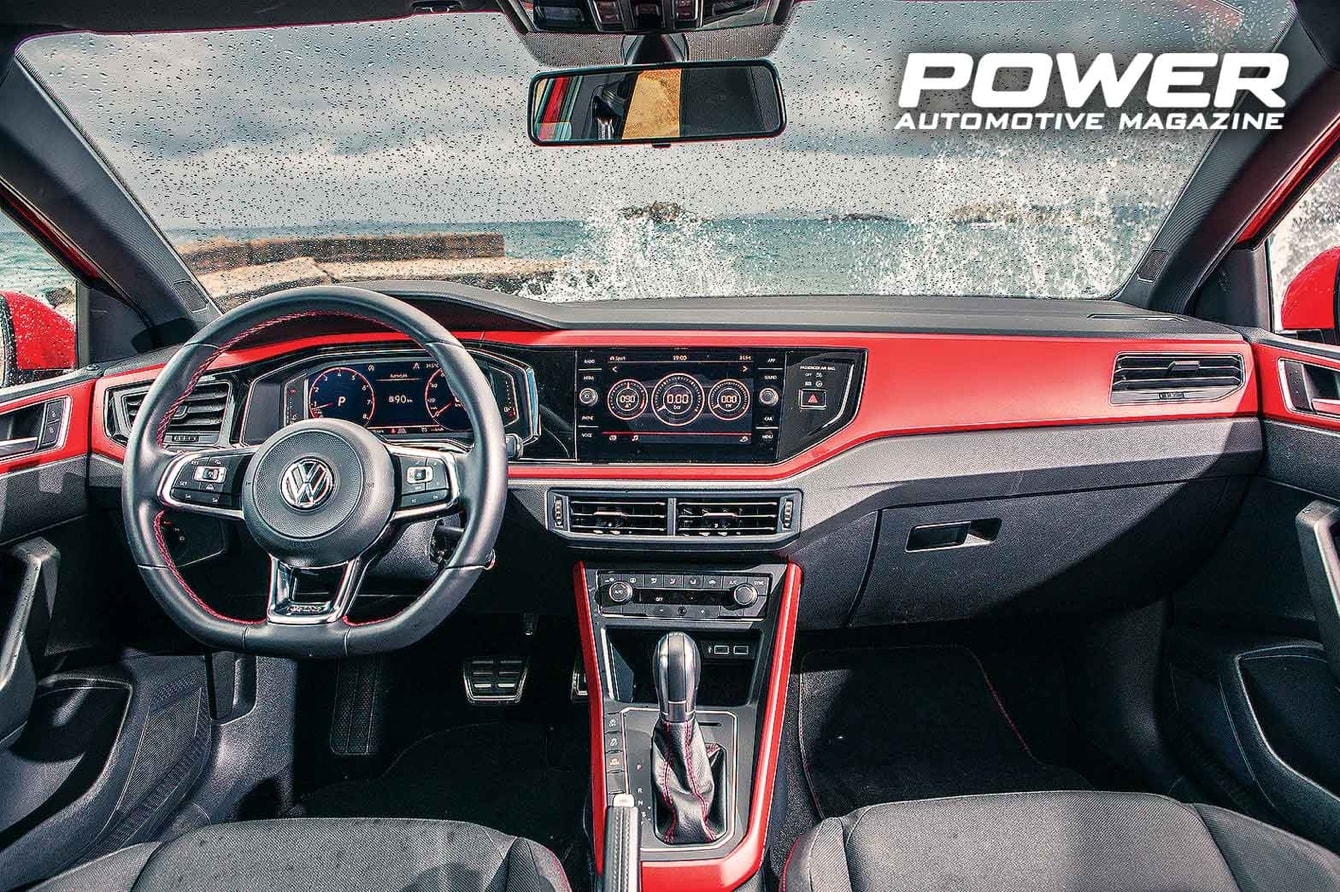 Η καμπίνα έχει αποκτήσει ενδιαφέρον, αφού το ταμπλό διαθέτει χρώμα, μιας και διάφορα χρωματιστά φιλέτα έχουν πάρει τη θέση τους, κάτι που μας αρέσει. Η μεγάλη κεντρική οθόνη αφής 8 ιντσών είναι γνώριμη από άλλα μοντέλα του group και αν κάποιος επιλέξει από τον προαιρετικό εξοπλισμό τον ψηφιακό πίνακα οργάνων, Active info Display, θα εντυπωσιαστεί από την εμφάνιση και τις λειτουργίες που προσφέρει. Τα υλικά κατασκευής στο εσωτερικό είναι πολύ καλά και δεμένα άριστα μεταξύ τους και, όπως πάντα, μέσα στο Polo GTi νιώθεις ότι, όσον αφορά την ποιότητα, ξεχωρίζει στην κατηγορία του. Ο χώρος αποσκευών με τα 305lt είναι οκ, αλλά αν κάνεις εκδρομούλα με τέσσερα άτομα, μάλλον θα προβληματιστείς.